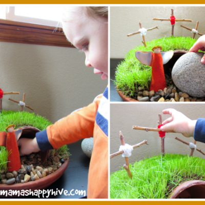 Each month I change the theme of our worship shelves for Little Bee to enjoy hands-on Bible lessons for learning and play. We have enjoyed Jonah and the Whale, the story of the Nativity, and Noah’s Ark. For an overview of how we use our worship shelves – visit Christian Montessori Shelves. This month our shelves are Montessori Inspired Christian Easter…