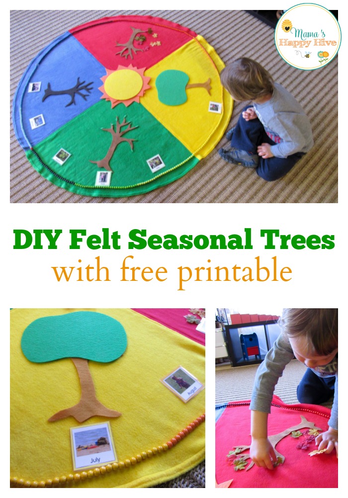 I thought it would be helpful for Little Bee to understand the seasons by using the example of a changing tree. I created a tree pattern (free printable) and cut out four felt trees. The winter tree I left bare, the spring tree has little green (felt) buds, the summer tree is full with green leaves, and the fall tree has autumn colored leaves. Little Bee placed the corresponding leaf patterns on each seasonal tree.