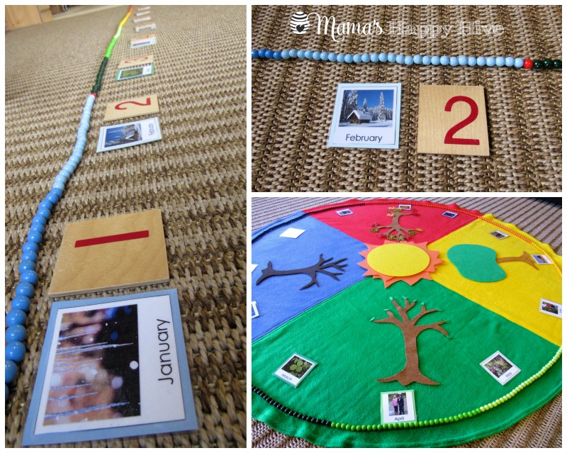 I color coded and laminated months of the year cards for Little Bee to match to the beaded year chain. The beaded chain can be laid out in a linear or circular fashion and matched to the cards. Little Bee also loved placing his Montessori counting numbers by each month. (Please note that these numbers only go up to 10.) A number printable or felt numbers could also be used.
