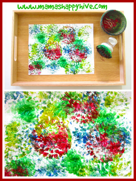 I love how this circle brush firework art turned out. It looks like a Monet painting to me. This tray was inspired from the Crafty Morning blog - Kids Fireworks Craft Using a Dish Brush.