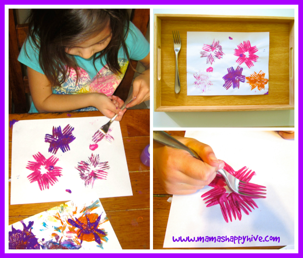 My niece enjoyed creating these fabulous fork fireworks. She had fun mixing the colors pink, purple, and white. These fork fireworks were inspired by the Crafty Morning blog - Kids Fireworks Crafts Using a Fork.