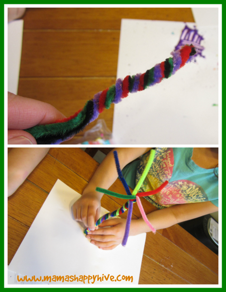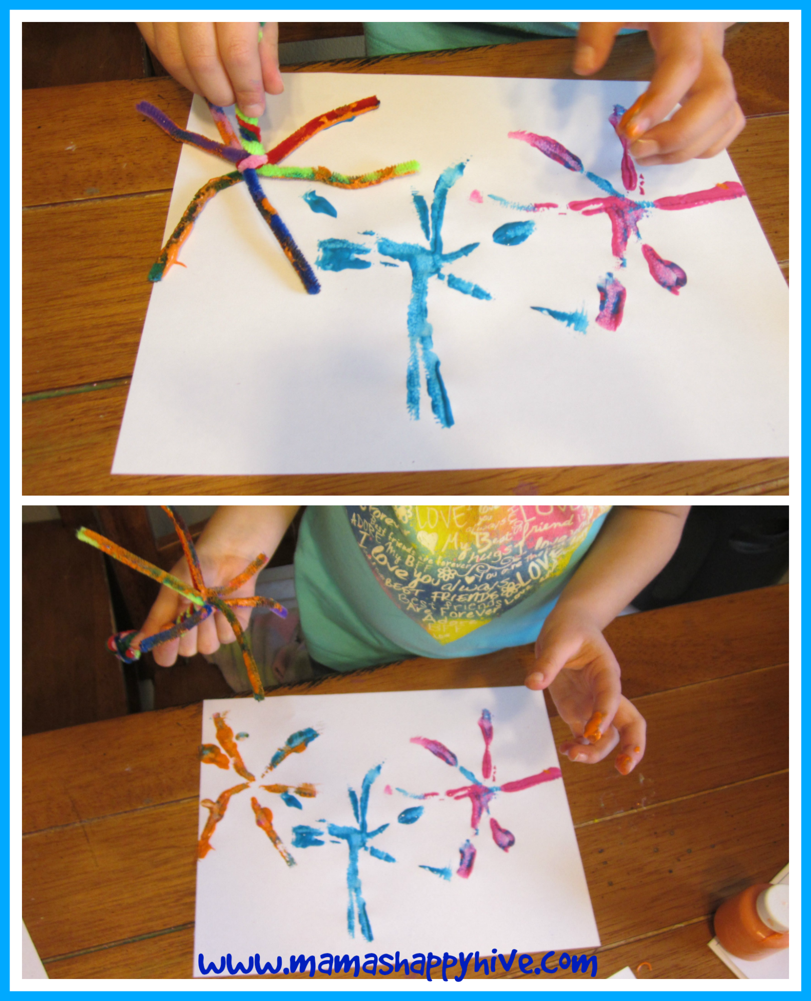 This pipe cleaner firework art tray was inspired by the Juggling with Kids blog - Firework Painting. I twisted 6 pipe cleaners together and then flared out the end as shown in the photo above. Every firework that we painted with the pipe cleaners turned out spectacular!