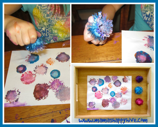 We got creative and tried painting fireworks with large pompoms. It's interesting to see the patterns that are created by using unique shapes to paint with. These pompom patterns would look awesome with sparkle paint.