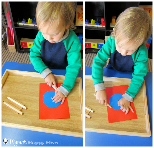 Little Bee had not worked with the metal insets before. I showed him how to trace the circle with a pencil. I wasn't sure if he was developmentally coordinated enough to actually draw around the circle himself. He really surprised me when he drew around the circle easily!