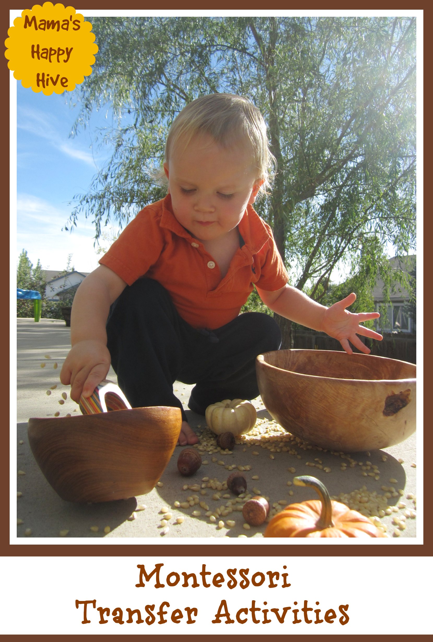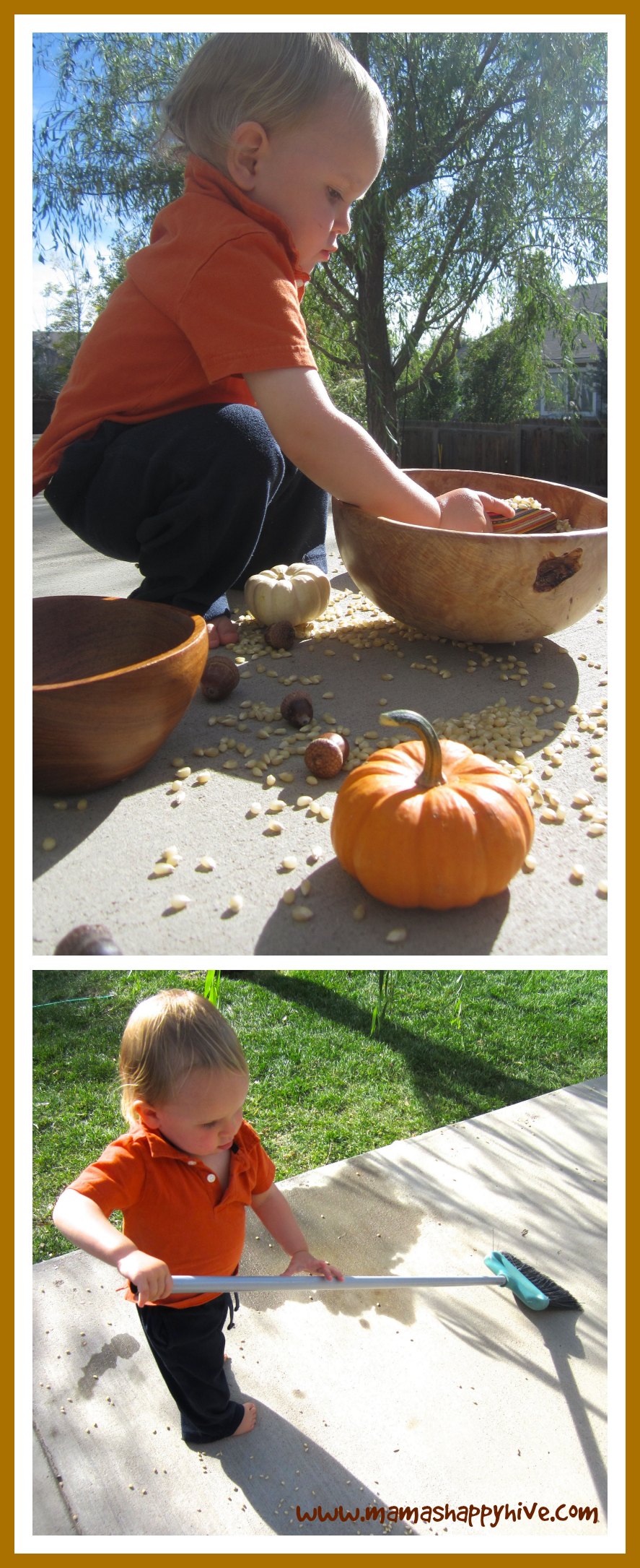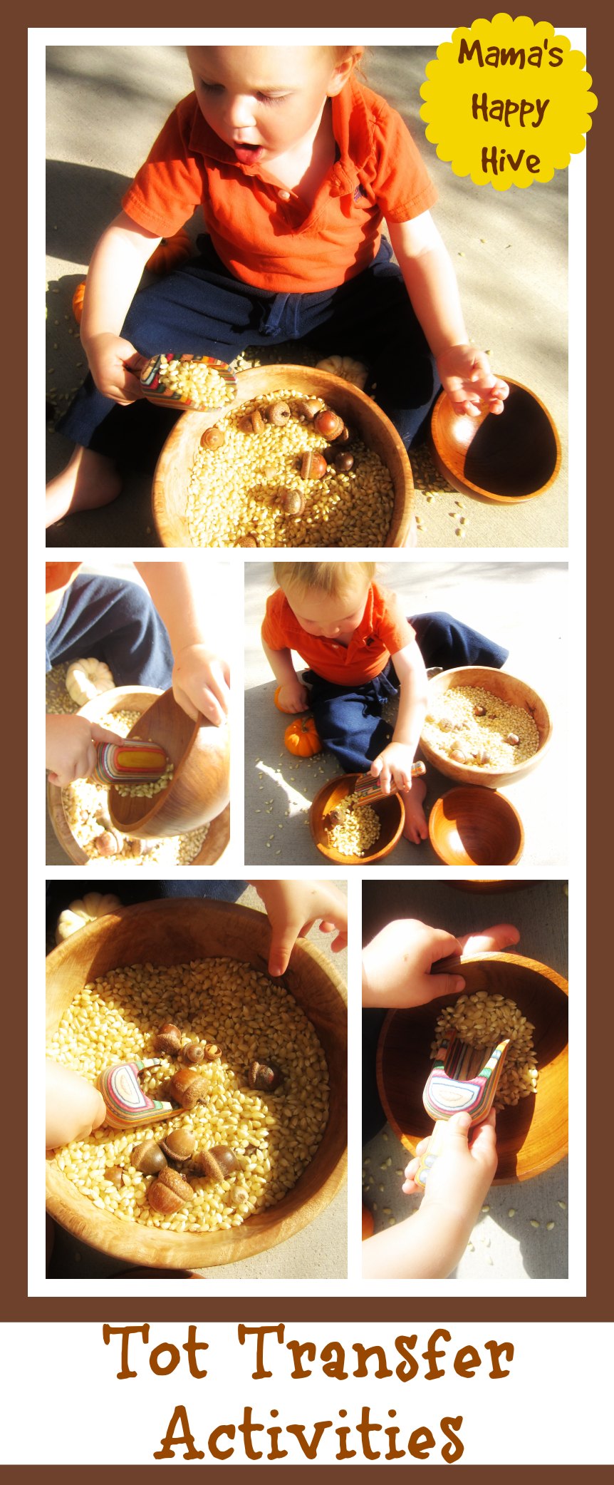Little Bee and I had fun with this beautiful Autumn sensory bowl full of corn kernels, acorns, and small pumpkins. As soon as Little Bee spotted this bowl full of exploration opportunities, he sat right down and made himself at home. I love that when I create something special for Little Bee to explore that he knows he is in for a treat. He literally begged for this bowl to be placed within his reach and this activity kept him busy for over an hour.