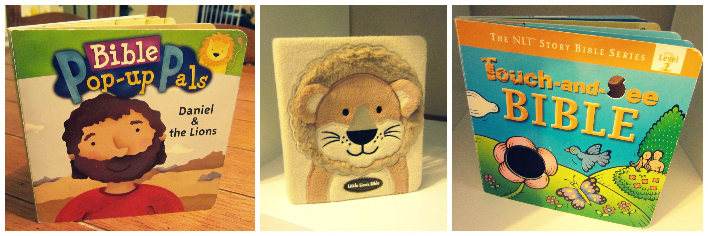 These "Lift and Look" Bible Story books shown below, are great for children under a year old. They have thick foam pages that are easy for young children to turn. Each page has a pop out section that is fun for a toddler to take out and put back.