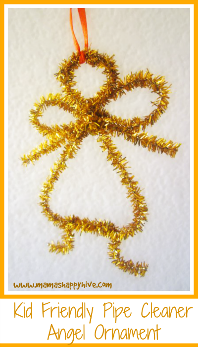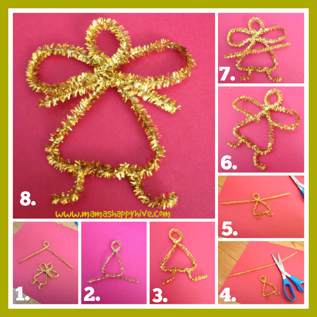 1. Cross the pipe cleaner in the middle creating a round head shape. 2. Bend the ends of the pipe cleaner towards the middle creating a triangle body shape. 3. Twist the pipe cleaners along the bottom side of the triangle a few times and then bend them out at the bottom to create feet. Trim the edges so that the feet are equal in size. 4. Take a second pipe cleaner and cut it 1/3 of the way across as shown. 5. Take the longer 2/3 part and place it behind the neck, wrap it around the neck once or twice. 6. Then create an oval with each side and tuck the end of the pipe cleaner around the neck once on both sides to create wings. 7. Take the shorter 1/3 cut part and wrap it once around the neck to create arms. Cut them so that the length is equal if necessary. 8. All done! Tie a ribbon around the top circle and hang this sweet little angel up as a Christmas decoration.