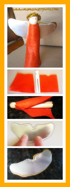 The second crafted angel creation is made out of a skinny wooden clothes pin peg person. You will need six materials to make this craft - a wooden peg person, one small orange flannel square, gold & silver craft paper, gold or yellow pipe cleaner, glue gun, scissors, and magic marker for the eyes (optional.) 1. Cut out a flannel shape with a bit of a flare at the end if you would like the angel to have a "skirt" type of outfit. In the second picture below, you can see the one cut out piece on the left is more in the shape of a triangle. This will create a flared look. The cut out piece on the right will create a skinnier outfit and is more in the shape of a square. To find out the correct size flannel to cut for the peg angel, I simply rolled the peg up in the material and noted the length that was needed in order to cover the entire peg person. 2. I started by hot glueing the neck of the flannel piece onto the peg person. I glued the front of the neck and then turned the peg person over and glued the back of the neck, one flap overlapping the other flap (see the third picture down.) After that, I put a straight line of glue all the way down the edge of the fabric and pressed the two edges together. Now the little craft angel has an outfit! 3. Next, I cut out silver wings and traced one size larger on gold craft paper. Then I glued the two pieces together. I placed a line of glue down the middle of the wings and attached it to the angel. 4. After that I took a gold glittery pipe cleaner and wrapped it in a circle shape two times. I then hot glued the pipe cleaner "halo" onto the angel's head. Finally, I put two orange dots on the angel's face for eyes.