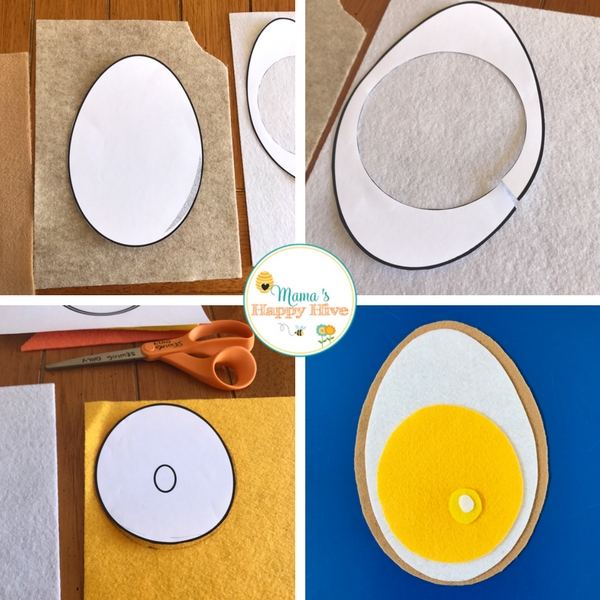 - Cut out the circle shape (the yellow yolk part) located on the third page. Trace the circle onto yellow felt and then cut it out again. Optional: you can cut out the smallest circle in a lighter yellow or white felt to create the "bullseye" part of a fertile egg.