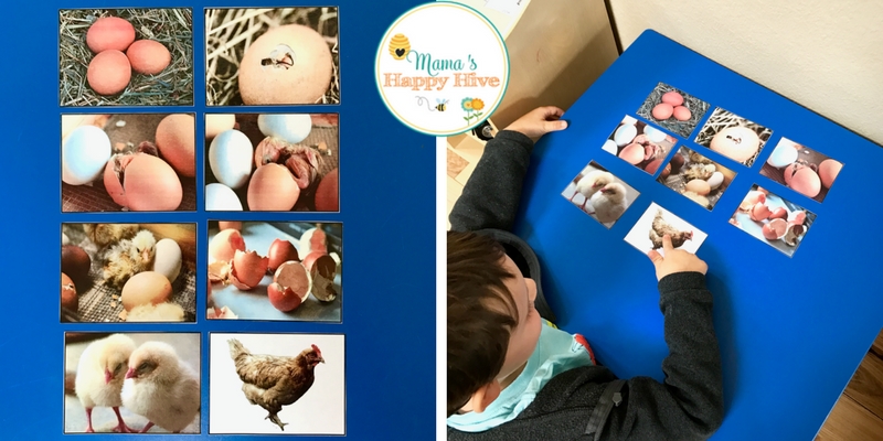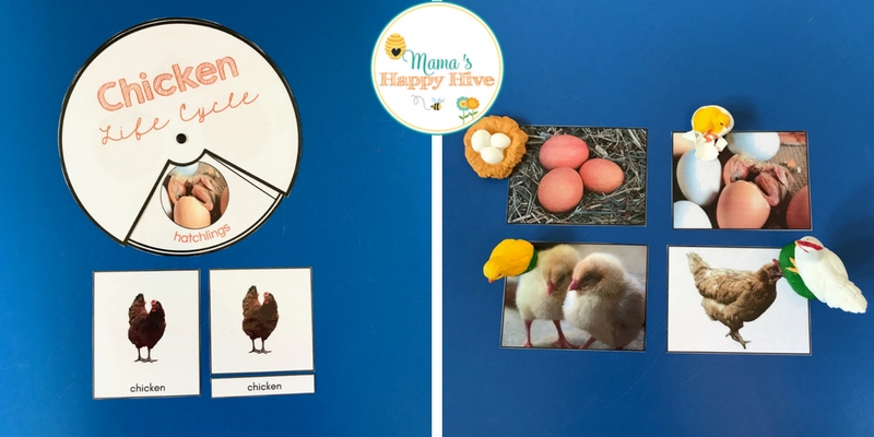 Also, included is a life-cycle spinner with four images. I combined the spinner with my farm life 3-part cards and also the chicken Safari Ltd life-cycle set. The 3-part cards are wonderful for a preschool aged child to use for vocabulary development and rational thinking. The matching of objects to cards is a wonderful activity for a younger (2-3 years) child to practice visual discrimination.