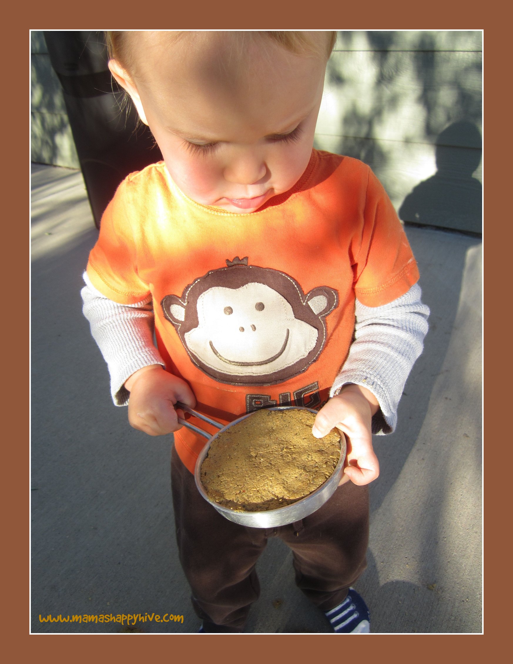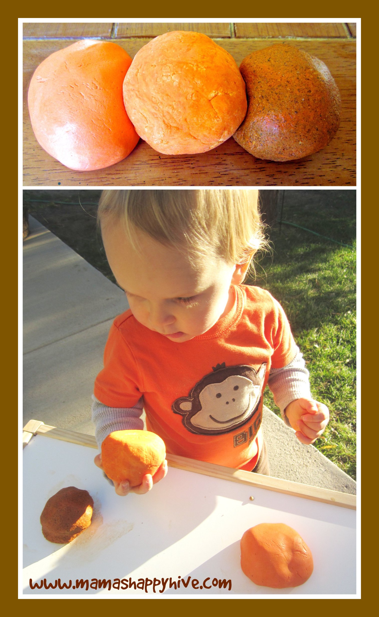 The last play dough on the right had the roughest texture because it was made out of sand. Please visit, "Pumpkin Moon Sand" for the recipe. The rough sand play dough was Little Bee's favorite. I had to distract him and hide the play dough when it was time to clean up. He was really attached to this gritty dough. I think he would of been happy to take it with him to dinner, bath time, and into his bed... if I let him!