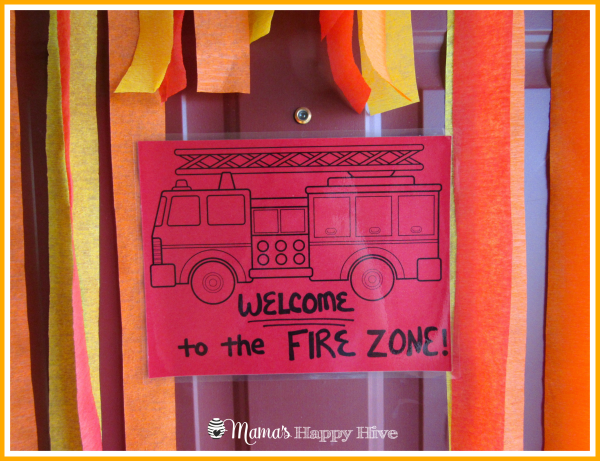 On the front door I hung red, orange, and yellow streamers along the entire length of the door. I also printed this free firetruck coloring page onto red paper, wrote my welcome on it with a sharpie marker, and laminated (optional) the truck printable. It was a simple yet fun way to decorate the front door.