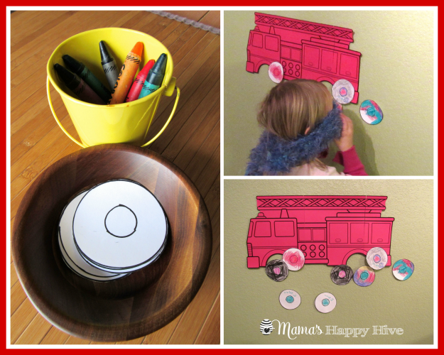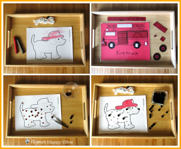 The kids enjoyed several firetruck tot trays using a free firetruck printable and an adorable fire dog printable. The first tot tray was set up as a coloring page with crayons. The second tot tray was a firetruck with various pieces of the firetruck cut out to velcro onto the matching part on the firetruck. I simply printed off two copies of the firetruck printable and cut out the pieces of the firetruck that I wanted to highlight. Little Bee loved this tot tray and naming the various parts of the firetruck - ladder, wheels, windows, siren light, bumper, and storage. The third tray was a fun tray for fine motor skill development by using tiny pompoms, tweezers, and black paint to create spots on the Dalmatian dog. The forth tray was a match the tiny black pompom to the black circles. These activities were inspired from the Catch My Party blog.