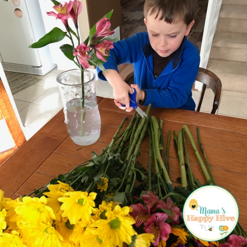 Creating a beautiful environment is one of the foundational principles of Montessori that we strive to maintain at home. For this reason, arranging flowers is a wonderful activity that allows children to express creativity while also developing fine motor skills. As a bonus, it adds a touch of color and beauty to their home, making the space even more inviting!