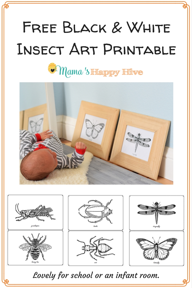 Let me explain how we use our shelves... I have prepared mostly language and math materials on our shelves and a couple unit study materials (insects and the five senses). We have done several unit studies about insects because my son is in love with grasshoppers, bumble bees, and rollie pollies. Because of this, I decided to hang up insect art on our walls. (Scroll all the way to the bottom of the post to download your free insect art printable!)