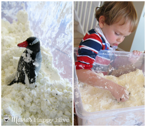 This sensory activity was messy, but Little Bee LOVES messy play! So the mess was worth the effort. He played with his Safari TOOB penguins in the snow for over an hour. As he played, I explained to him that penguins live in a cold environment where there is snow and icebergs. To represent the icebergs, I added a cup full of ice cubes that Little Bee had fun digging around to find.