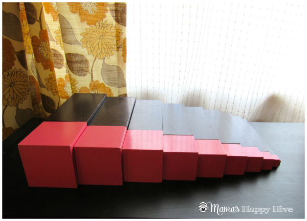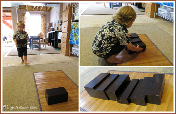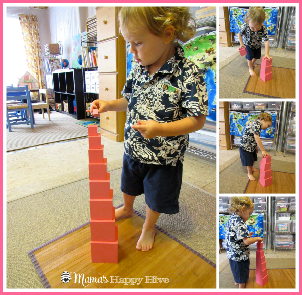 Our pink tower and brown stairs are displayed horizontally on the low shelf in our Montessori homeschool room. Little Bee enjoys carrying the pink tower to his mat and stacking it vertically. For a video on how to present the pink tower to your child for the first time, please visit - www.infomontessori.com - Pink Tower.