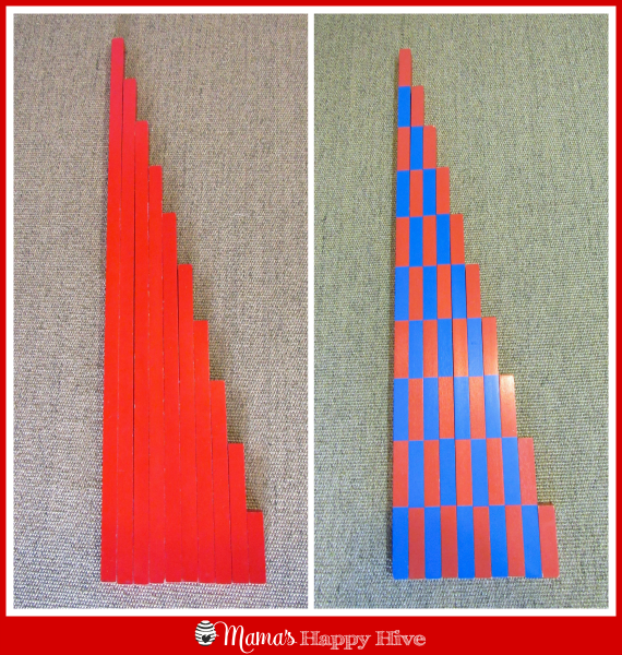 The reds rods build on the concept of long verses short (large verses small) that the child is already familiar with from building the pink tower and brown stairs. After the red rods are mastered, then the next material presented is the number rods. The number rods are divided into red and blue sections representing the quantities of 1-10. These colors guide the child into the abstract concept, of the meaning of a symbol (numbers), as it relates to a quantity. For an explanation on presenting the red rods and number rods, please visit www.infomontessori.com - Red Rods and www.infomontessori.com - Number Rods.