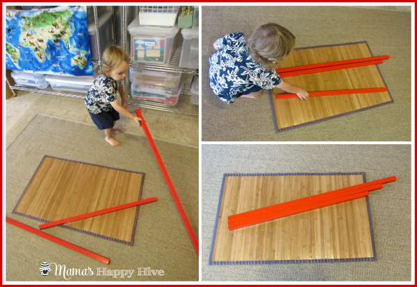 I showed Little Bee a simplified presentation of the red rods by using only the three longest rods. He enjoyed moving the long red rods into formation (longest to shortest). Moving these long heavy rods into formation is a wonderful gross motor activity for a toddler.