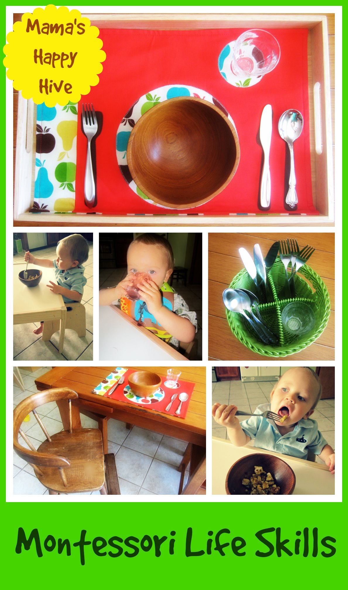 I store all the tot table setting supplies (real silverware, cloth napkin, wooden bowl, and glass cup) on the lowest shelf of the kitchen pantry. Little Bee is able to open the door himself, select the table setting supplies he desires, and then transport them to his tot table to place in the correct spot on his beautiful placemat.