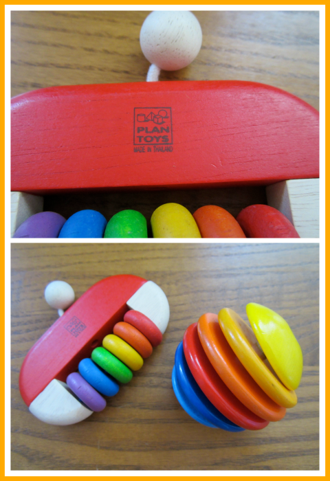 I give these two toys above 4 stars because both toys have a unique feel to them, however they didn't keep Little Bee's attention as much as the 5 star toys. The PLAN toy rattle (*similar toy) has a little wooden knob for the baby to put into their mouth for exploration. The round HABA ball toy (*similar toy) feels elastic and separates slightly when pulled.