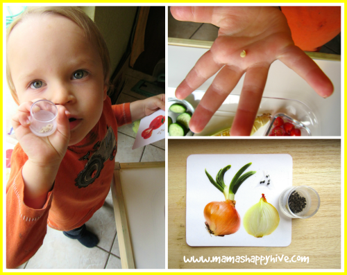 For the next activity, I encouraged Little Bee to open the seed containers to explore the seeds found inside. He poured the seeds onto his tray and then he used his fine motor skills (pincer grasp) to pick each tiny seed up and return it to the small container. This was a fantastic hand-eye coordinated work and a wonderful opportunity for Little Bee to acquaint himself with the different shapes and sizes of various vegetables seeds.