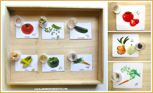 I am going to share several ways that planning a summer garden can be enjoyable and special for kids. First, it's important to introduce the names of the vegetables to the child. This gives the child an opportunity for identifying the shapes, textures, tastes, colors, and patterns of each vegetable by engaging in object to card matching work. In the following activities, I have set up a fun game of identifying seeds and matching them to their corresponding vegetables. All of this identifying work, helps a child to prepare for planning and planting a garden. There are also practical life skills that a child can learn that include caring for the plants and preparing the soil for planting.