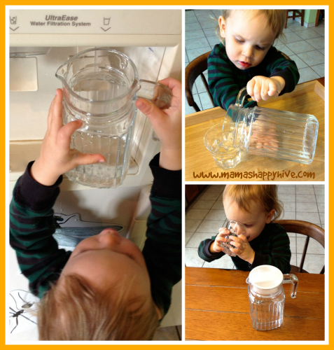 Little Bee loves to pour his own water into a cup to drink. He also watches closely and has learned to use the water dispenser on the fridge. He is very resourceful! He then will transfer the water pitcher to the table where he pours it into his glass cup. Little Bee is 23 months old. (The chair you see him sitting in at the adult table is easily pulled out from the table by Little Bee and then he climbs up all by himself into the chair. He does need help with pushing the chair close to the table once he is sitting in it.)