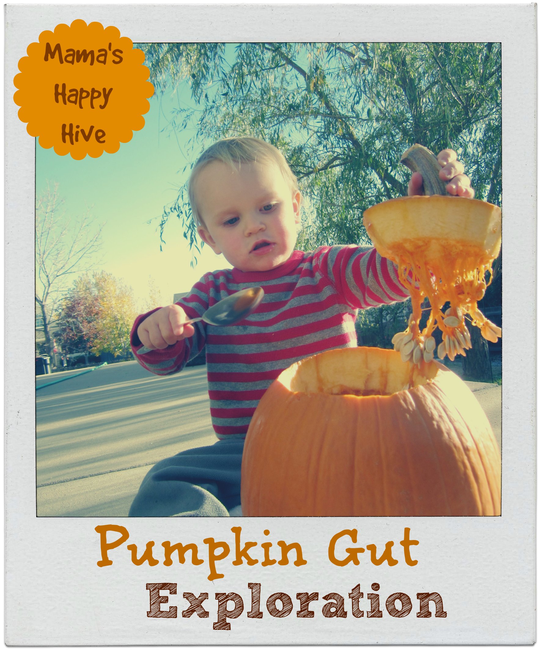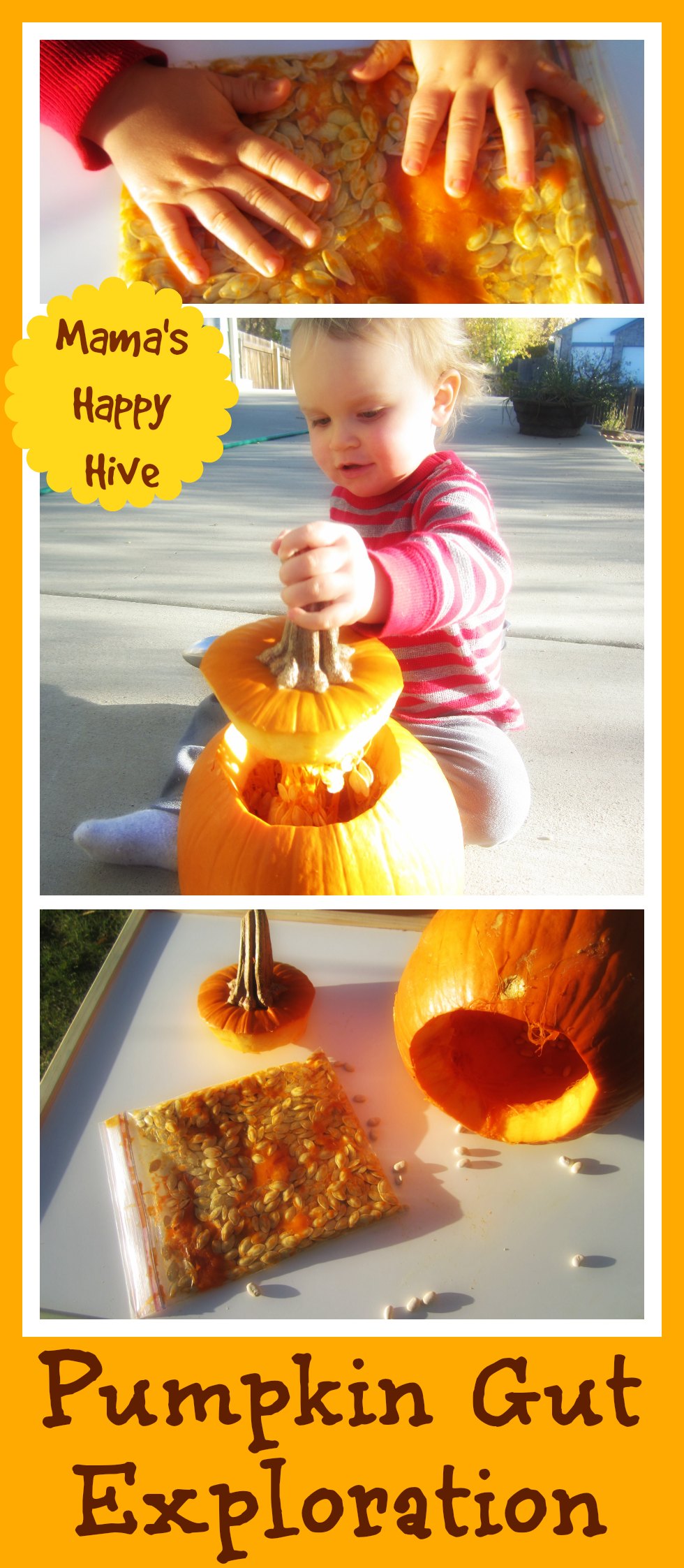 Last week, I cut the top off one of our fall pumpkins and let Little Bee explore the insides. He was fascinated with lifting the pumpkin top up to reveal the "guts" hanging down. He squished the guts around and enjoyed the whole gooey mess!