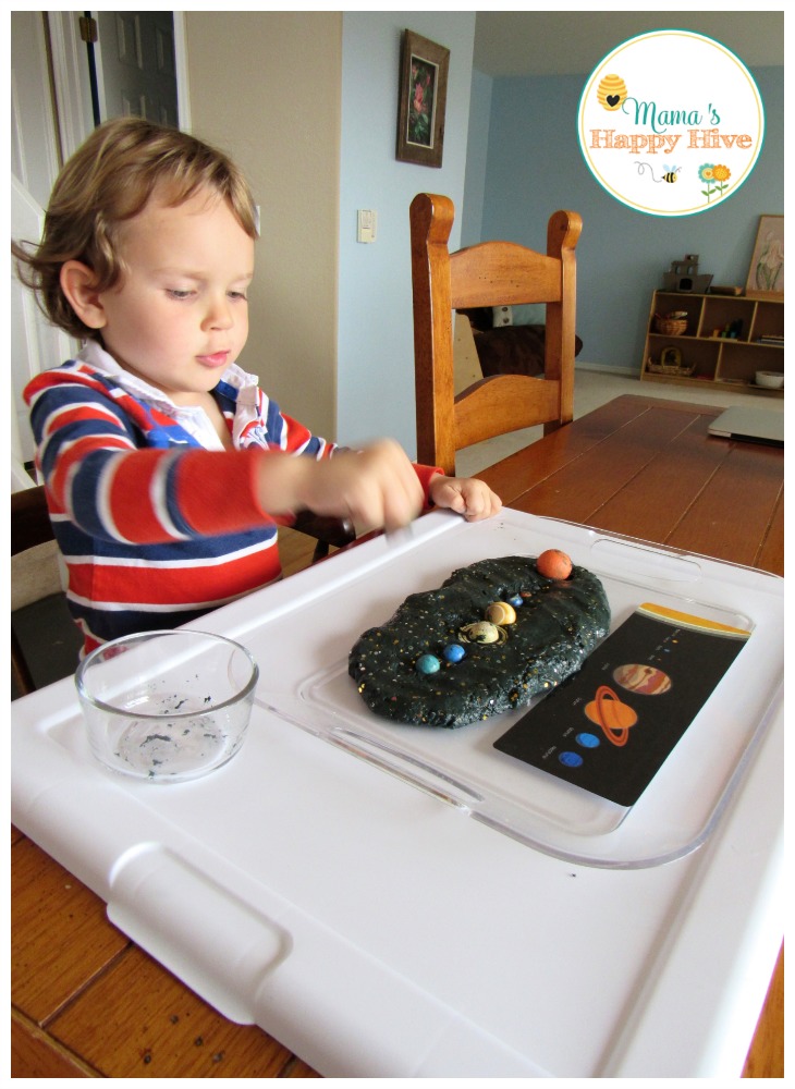 Next we learned the order of the planets (starting from the sun outwards) by using a Solar System Diagram as a guide, the Safari Ltd Planets, and galaxy play dough. I created the galaxy dough by making no-cook play dough, adding black food coloring, and gold/silver glitter to represent the night sky. Little Bee followed the pattern from the Solar System Diagram as he smushed the planets into the galaxy dough.