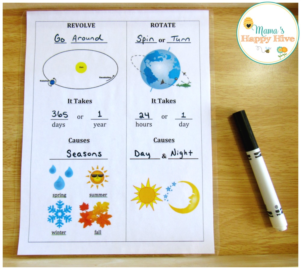 For an older preschool or kindergarten aged child, this "Revolve vs. Rotate Chart" is a wonderful printable that explains the difference between revolving and rotating. It explains that the earth takes 365 days to revolve around the sun and it takes the earth 24 hours to rotate. The earth revolving around the sun causes the seasons and the rotation of the earth causes day and night. I laminated the printable so that the fill-in-the-blanks could be erased and used again.