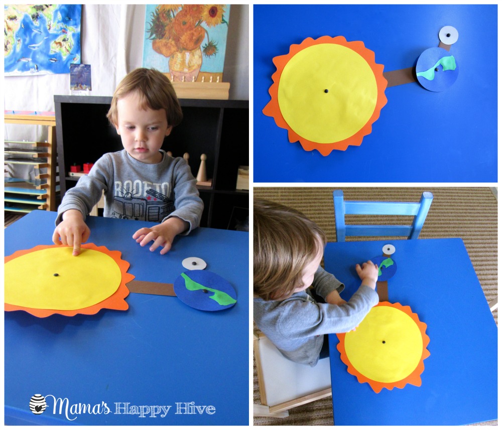 Even though it is not officially Little Bee's birthday, we practiced "revolving" around the sun with our Montessori globe. He walked the globe around the sun and he also practiced gently rolling the globe around the sun. One revolution of the earth around the sun takes 365 days (1 year) and this mat shows the changing of the seasons for the duration of a year.