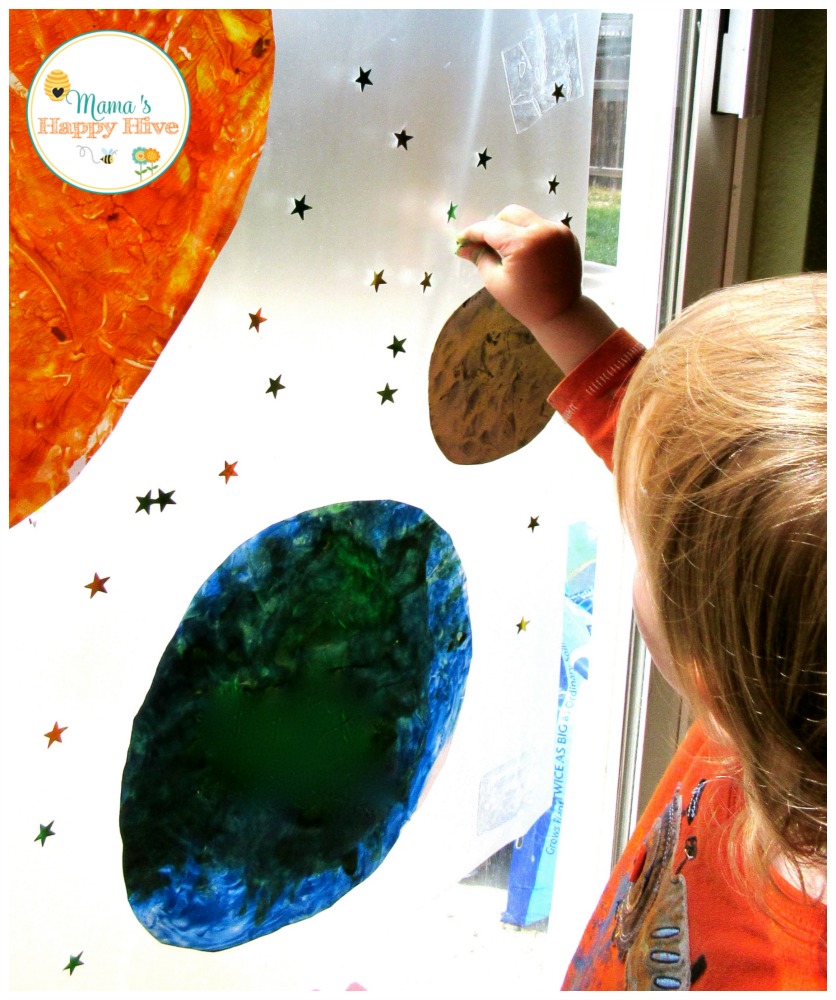 I taped sticky contact paper on the sliding glass door and Little Bee helped to place the cut out sun, earth, and moon onto the sticky surface. Then he had fun filling in the open spaces with star stickers.