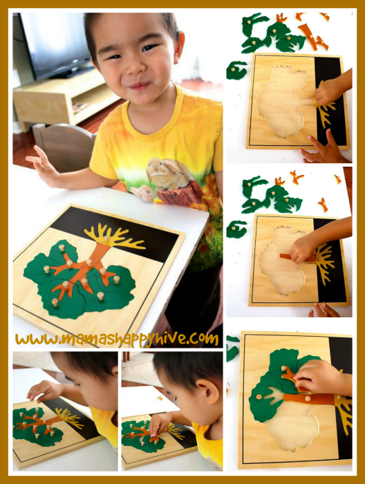I do not own my own tree puzzle yet... so my Montessori blogging friend, Elaine graciously let me use these sweet pictures of her son assembling the tree puzzle. She has a beautiful blog called, Planting Peas where she writes amazing posts on her Montessori homeschooling journey.