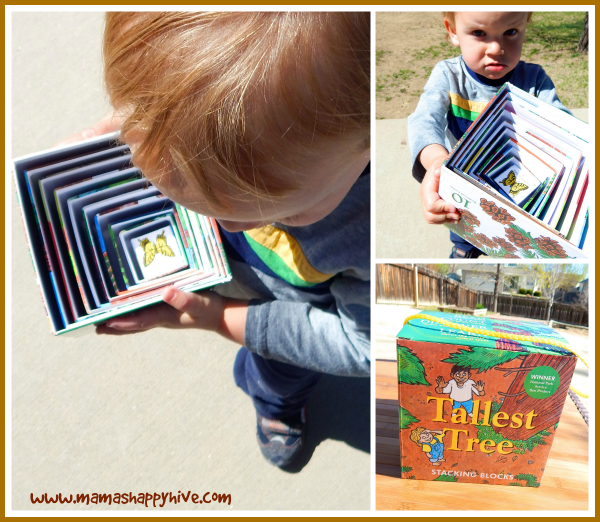 Little Bee loved stacking these boxes into a gorgeous Redwood tree. He used his gross motor skills and the art of sequencing to stack the boxes in order from largest to smallest. While Little Bee stacked the boxes higher and higher, I explained to him that the picture on the side of the boxes was a Redwood tree and it is the tallest tree of all the trees.