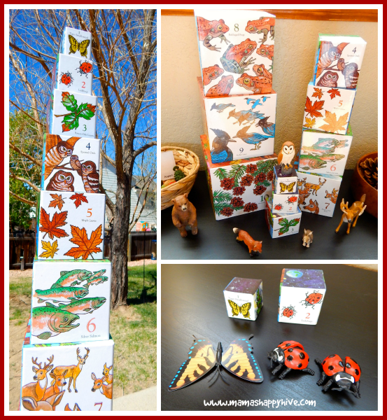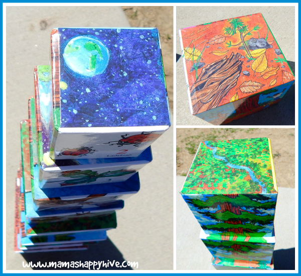 Each side of the boxes has amazing art that displays a different ecology-related activity for hands on learning. One side is a majestic Redwood tree, the second side is a counting with animals activity, the third side is creatures who live in a forest habitat, and the fourth side is a sweet poem about the tree. On the top of each box there are pictures that start from the forest floor and ascend into outer space.